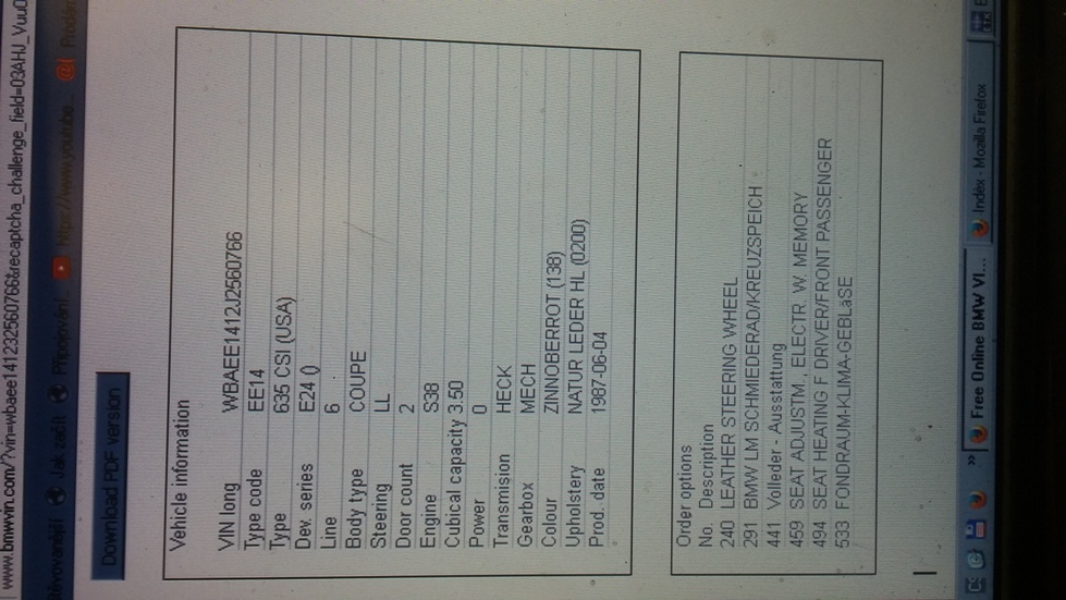 Kamarad Ondra prodava M6 z r.v. 87 dovoz z USA,najeto 105 t. mil, v zapocate renovaci,vuz byl kompletne odstrojen,byla opravena karoserie do top stavu z original dilu BMW,kompletne vymeneno predni celo z duvodu mensiho poskozeni na prave strane o sloupek znacky (viz foto prednich mrizek) a vymenena spodni cast za zadnim levym kolem,vuz byl vesmes bez koroze,delsi dobu odstaven v USA venku na slunci,coz melo za nasledek prasknuti palubky a vysisovani kuze uvnitr,Dale byl pak udelan lak do original cervene,zakoupily se original dily na predni napravu,ktere se tam namontovaly,zadni naprava zustala puvodni na voze,kola alu original BBS 415 mm.Okna jsou vporadku,neposkozena,ostatni veci jako svetla,narazniky (jsou to jiz ty kratsi,pekne,jako ma evropa od r. 87),listy,chromy,vyfuk jsou puvodni,motor ma sundanou hlavu,na ktere se udelaly ventily a stiratka,ktera byla ztvrdla,spojka puvodni,prevodovka sportka take,s prvnim stupnem razenym normalne dopredu, diferencial svorny na naprave.Vnitrek je ve svetle kuzi pred renovaci,byl jiz dan do calounictvi,kde se zahadne stratily predni sedadla recaro v elektrice,takze jsou k vozu normalni svetle,mechanicky ovladane,take tam zmizela leva spodni cast calouneni dveri.Komplletne je jiz vse zpatky,Vsechny dily vozu jsem z Ondrou a Honzou podrobne nafotil a popsal. Vuz stal v nakupu s dopravou,nahradnimi dily BMW,vyvarenim a lakovanim a ostatnima starostma 740 t. kc a je za tuto castku k prodeji.Jsou k ni dovozove papiry s doklady USA,mozno bezproblemu prihlasit na veteranske doklady po dokoncene renovaci.Prodava se z duvodu zakoupeni dalsi M635 pred lakem,ktera je jiz nalakovana a dostrojuje se, aby mohla cca do 14 dni jezdit. V pripade zajmu volejte pro podrobne info majiteli Ondrovi t.737258871, nebo info u mě,k vozu je celkem cca 50 foto,par jich vlozim a pro predstavivost foto vozu v teto barve v kompletu
